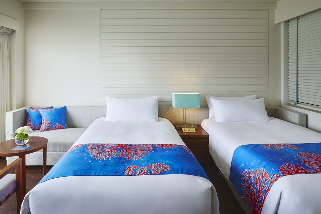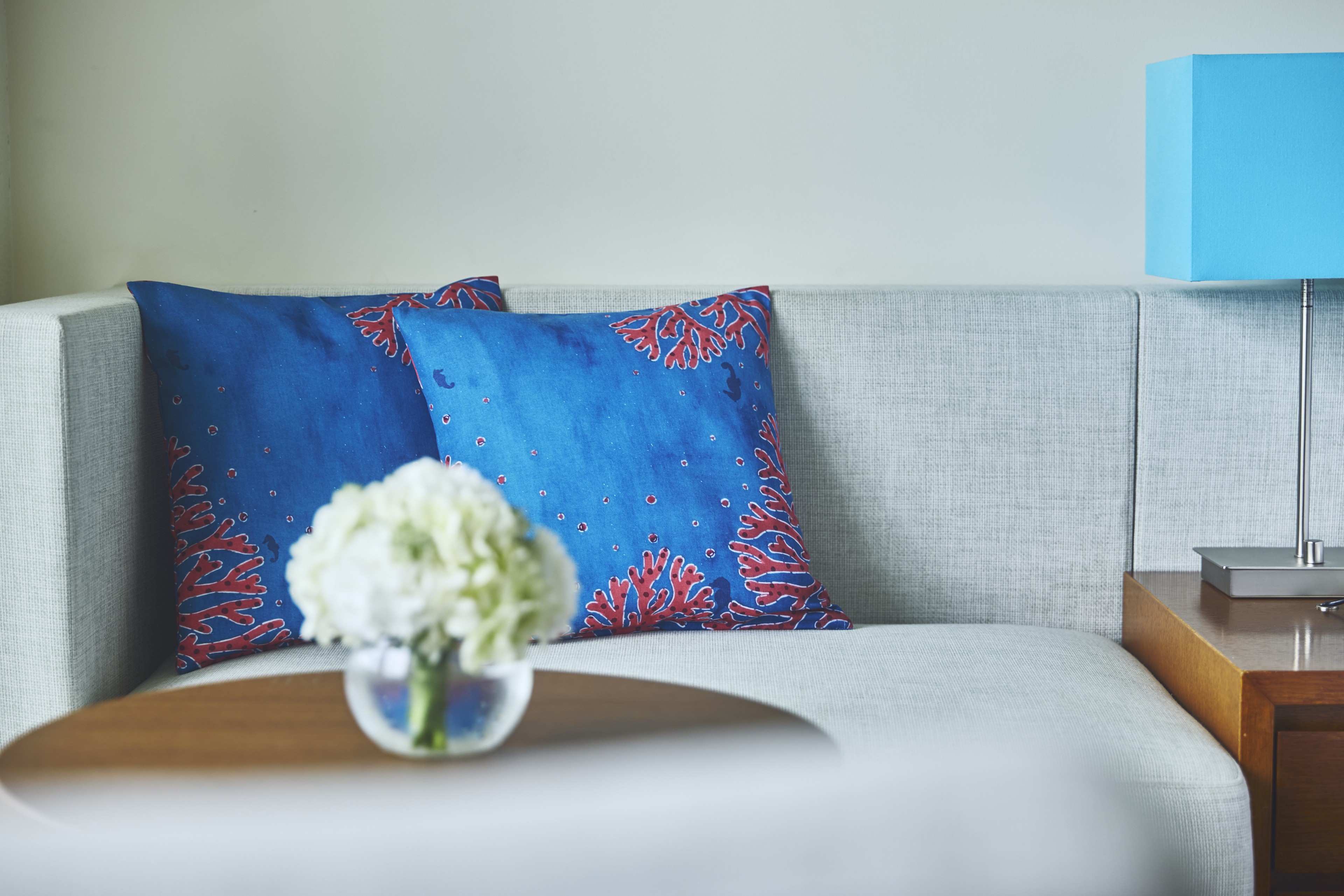 窓の外に広がる東シナ海の絶景と調和する、明るく爽やかなインテリア。万座沖のサンゴ礁をモチーフにした紅型デザインのファブリックが、沖縄らしい彩りを添えます。伝統工芸「紅型」とサンゴの海の美しさをぜひご体感ください。